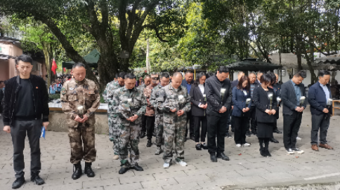 烈士合葬墓前,庄严肃穆,全体人员向革命烈士集体默哀,退役军人代表向革命烈士敬献花篮。随着《献花曲》响起,镇领导班子代表整理缎带,全体参加祭扫的人员默哀致敬,缅怀先烈,寄托哀思。